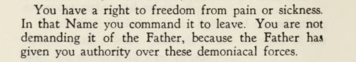 Instead of asking God to heal the sick and accepting whatever happens next as the expression of the divine will, or just praying for the sick, the believer can command healing.
